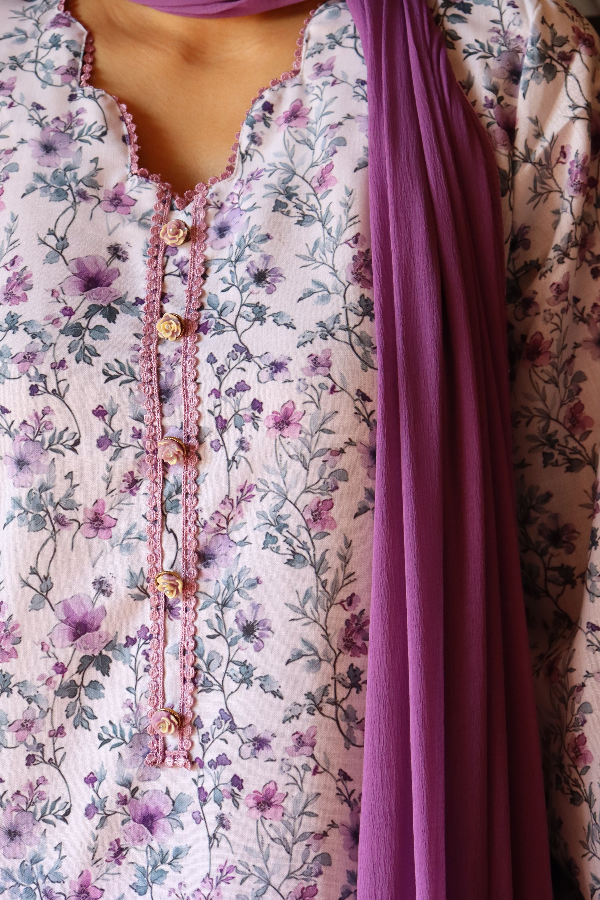 Grace meets elegance in this luxurious cullote with straight fitĀ kurta Set, designed for the modern woman who appreciates fine detailing and timeless style. Made from premium wrinkle freeĀ cotton, this ensemble features pretty lavenderĀ FloralĀ print on pure whiteĀ shirt paired with lavenderĀ colored straight fit pants, for that charming combination.
