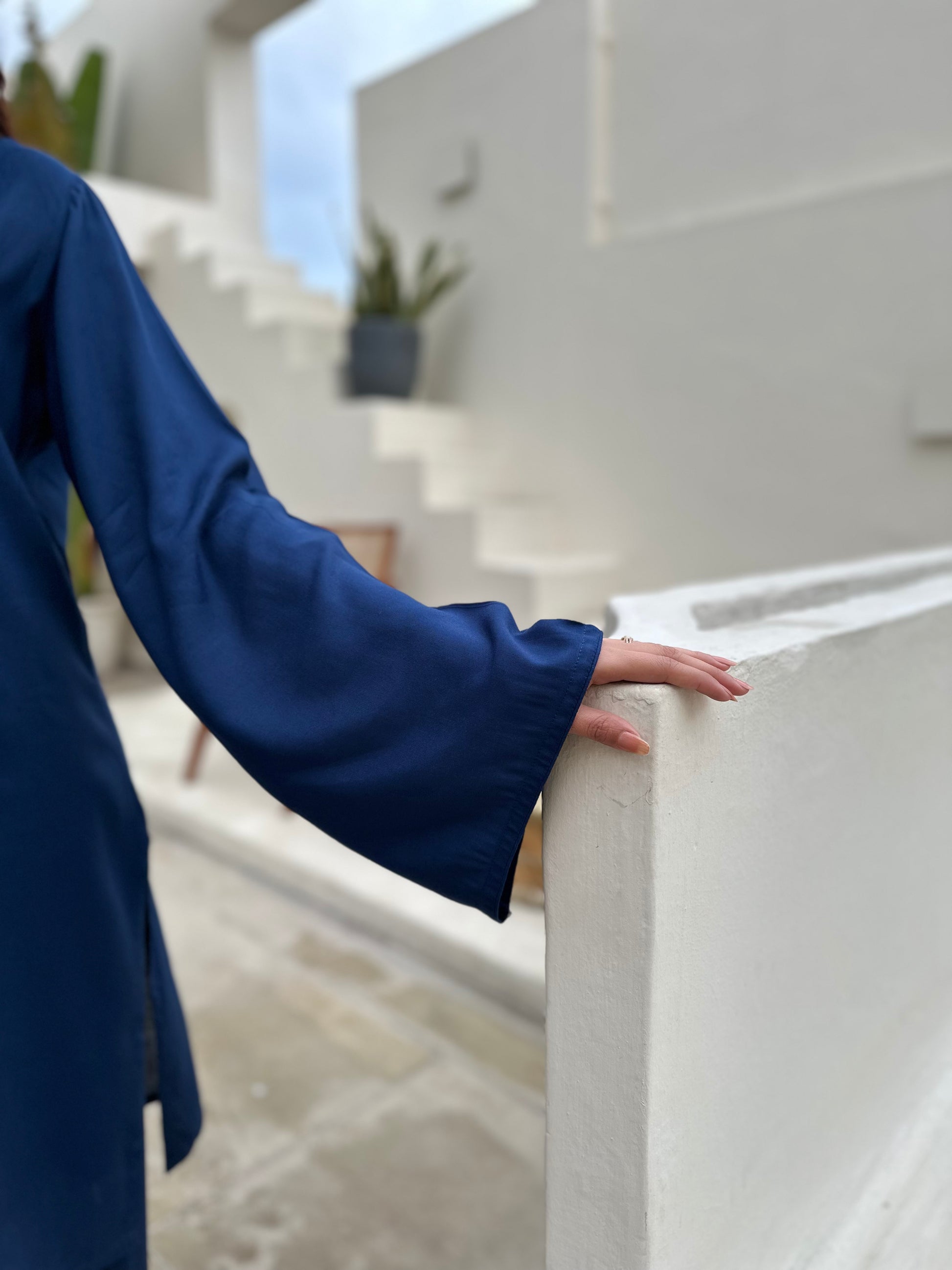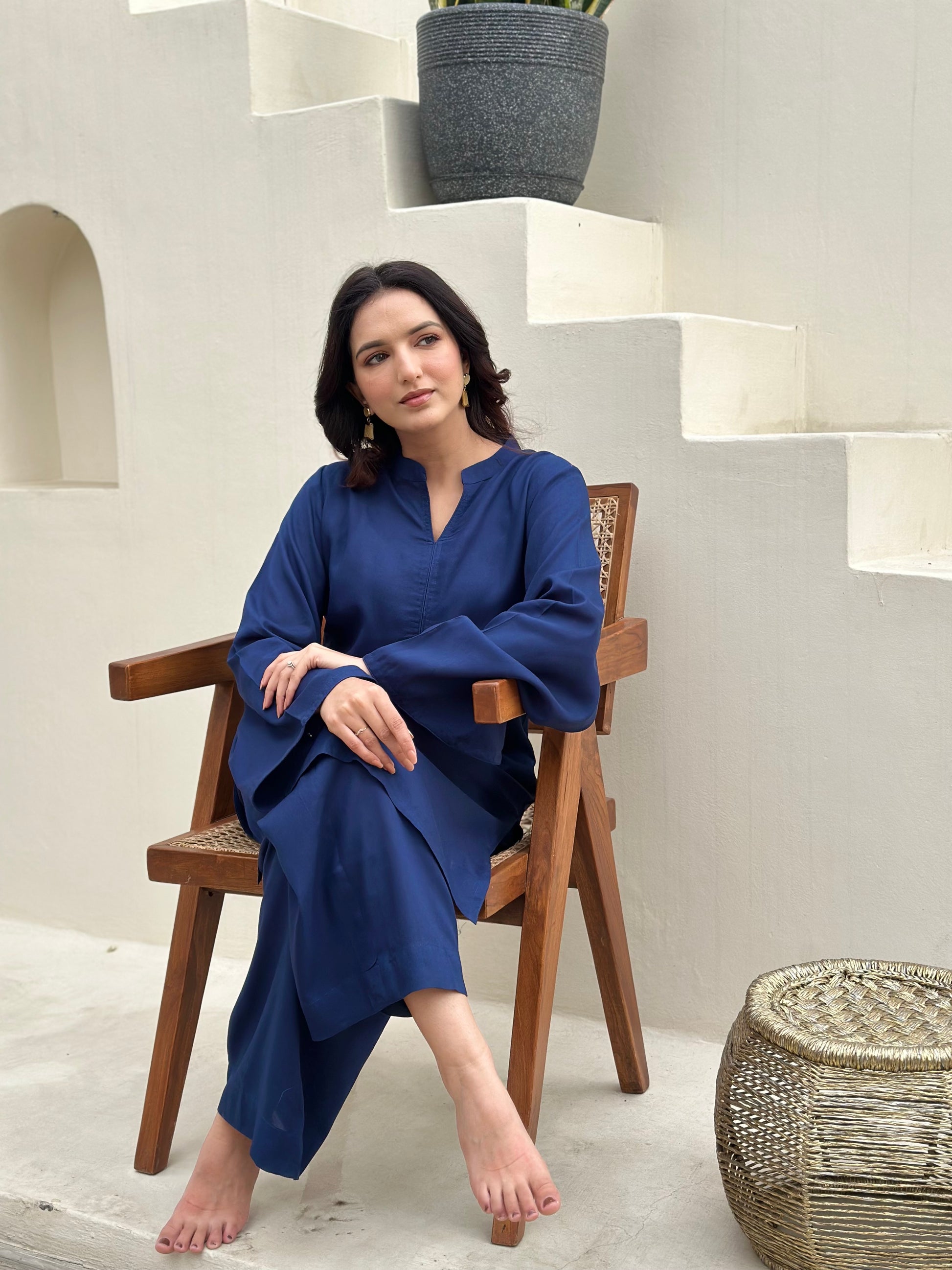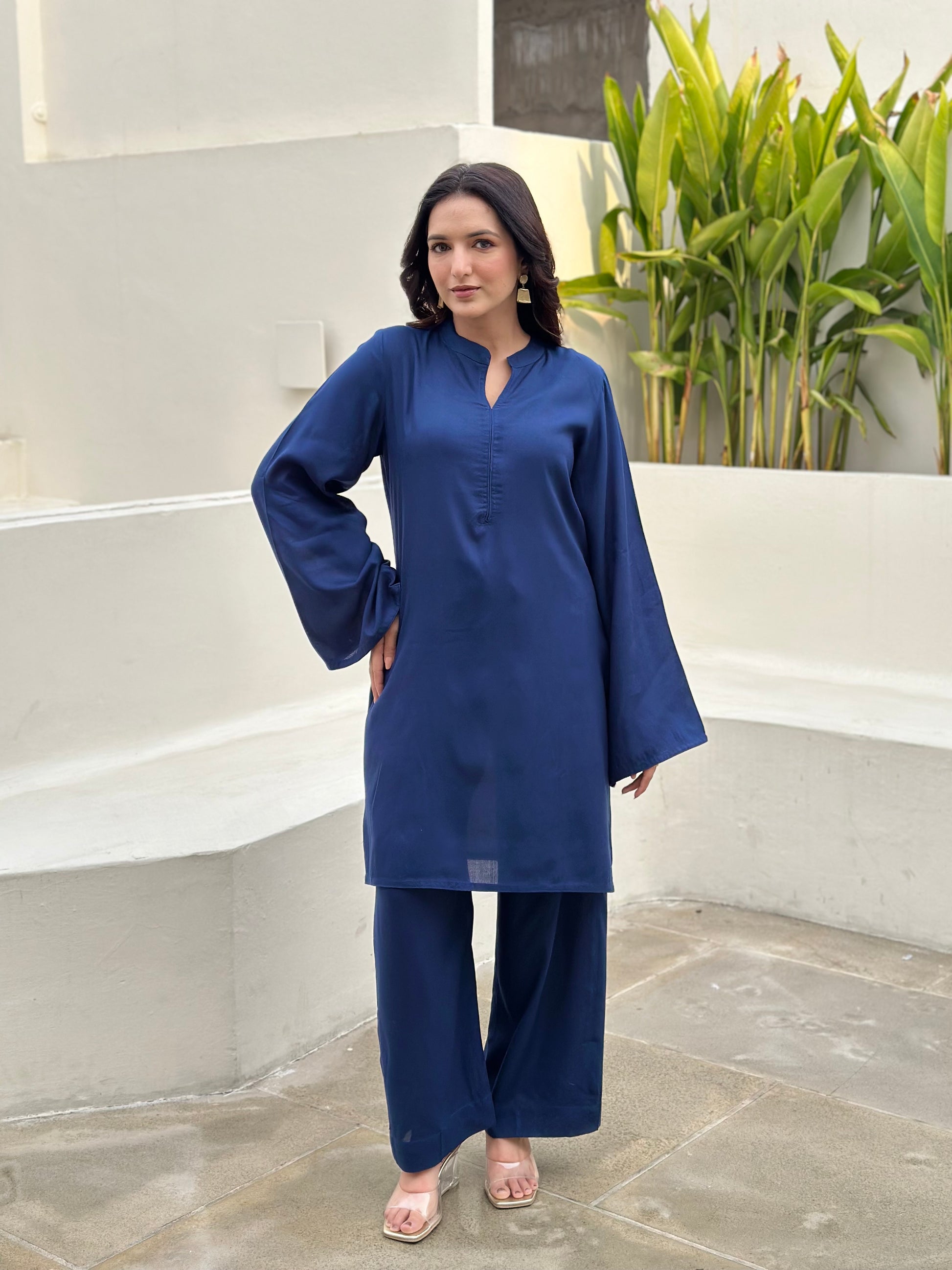 This monochrome Co-ord set captures minimalism through deep blue pallete and relaxed modest tailoring. This ensemble delivers a cohesive silhouette that balance is structure with fluid comfort in breathable fabric while maintaining a polished appearance. Influence by Middle Eastern, modest fashion aesthetics, The loose fit, prioritise versatility, and effortless sophistication.