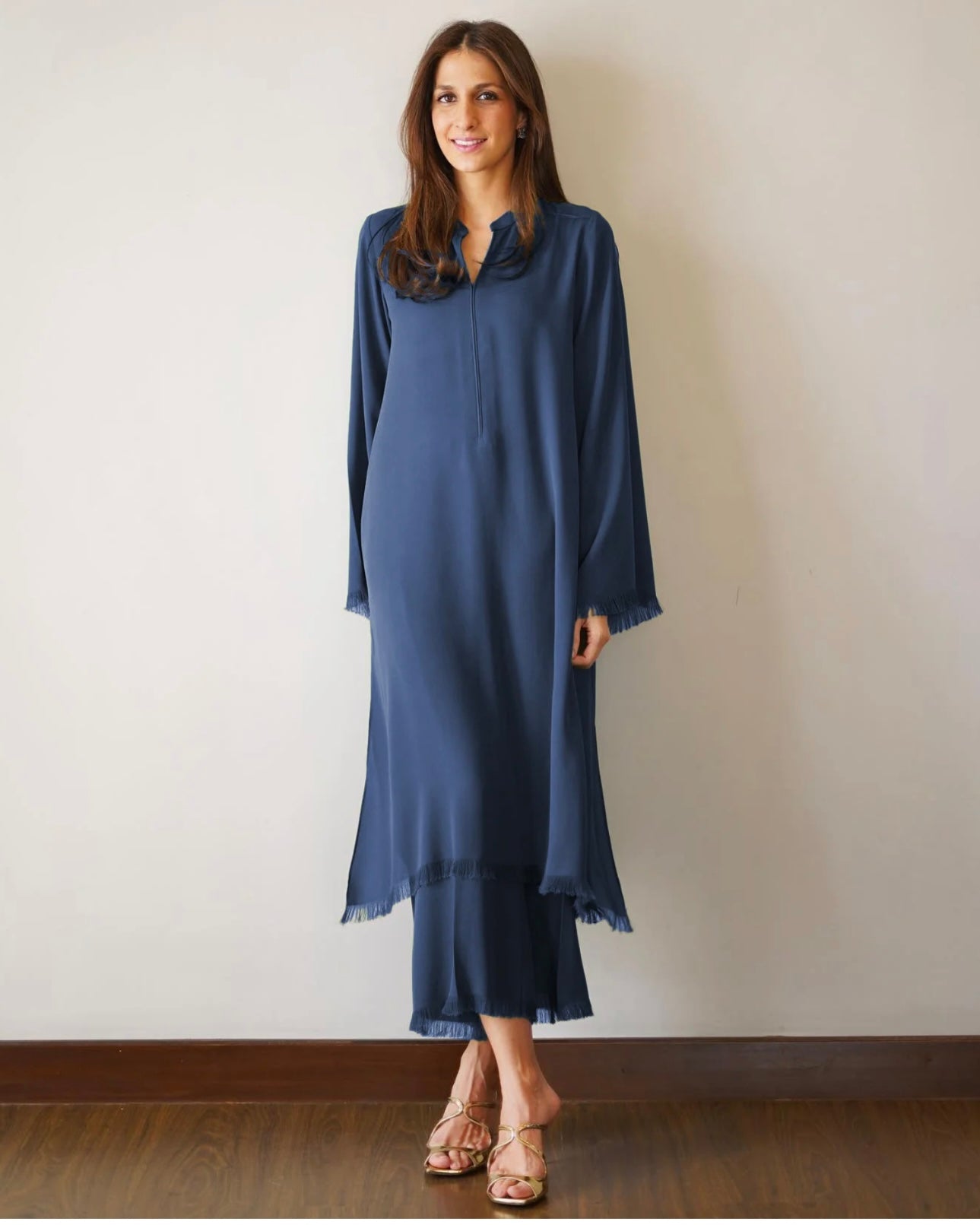 Elevate your summer style effortlessly with our Pakistani Fringe Co Ord Set. This elegant outfit offers both grace and comfort. It's inspired by traditional Pakistani designs. You will feel cool and chic all day long. This set is perfect for sunny weather.
